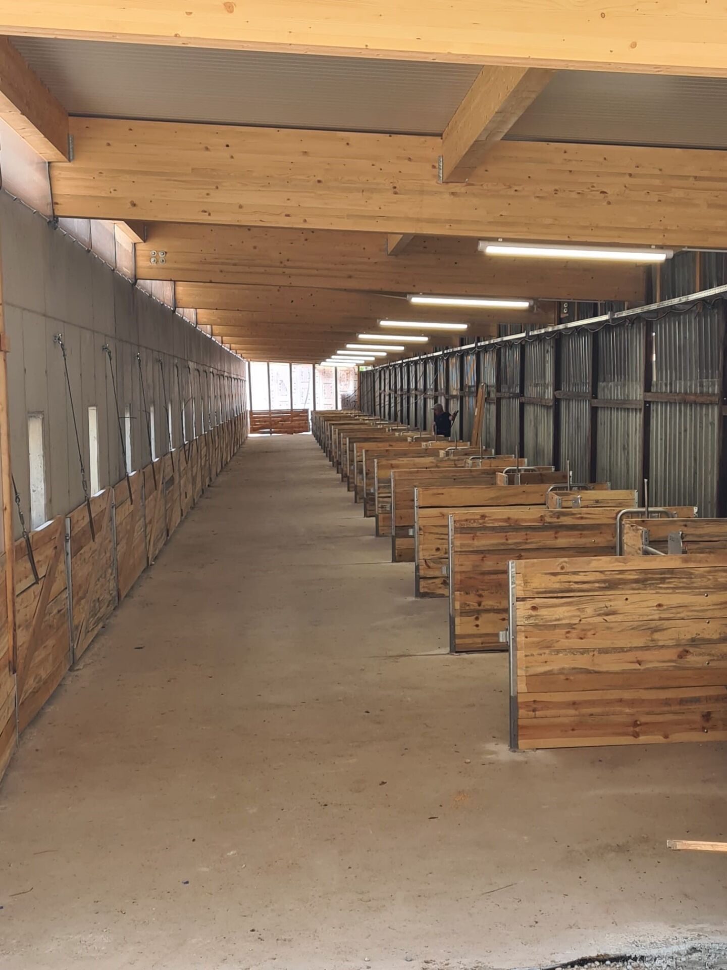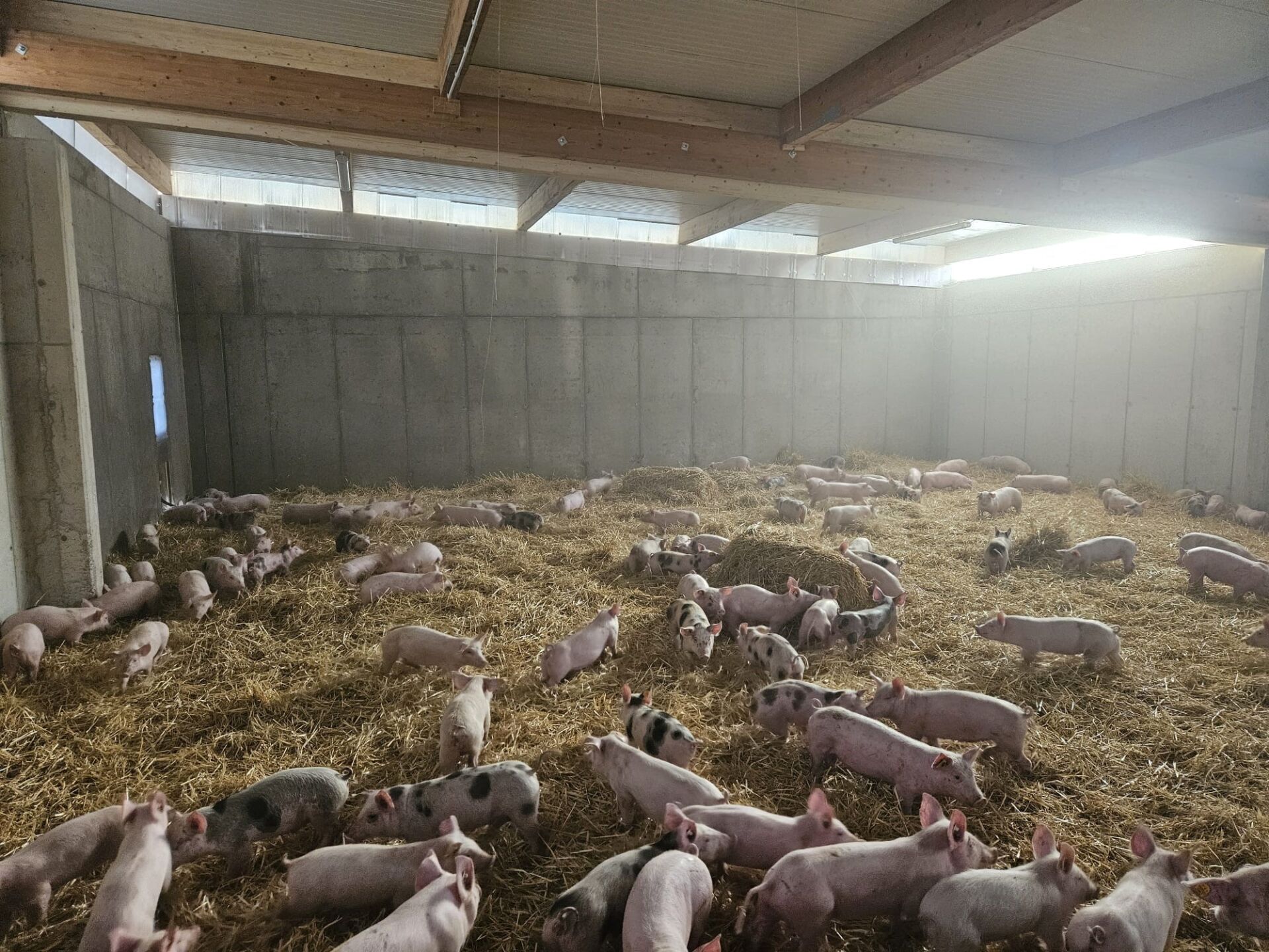 Am neuen Standort am Rande des Föhrenwaldes hat die Familie moderne Stallanlagen errichtet, die optimale Bedingungen für Tierwohl und nachhaltige Bewirtschaftung schaffen. Entstanden sind ein Abferkelstall, ein Gruppensäugestall, ein Absetzstall sowie Bereiche für die Ferkelaufzucht und die Jungsauenaufzucht. Alle Ställe sind großzügig, tiergerecht und auf moderne Standards ausgerichtet – mit Strohhaltung, viel Platz und Auslaufmöglichkeiten im Freien. Die Fütterung erfolgt überwiegend aus hofeigenem Anbau, ergänzt durch überschüssige Bio-Lebensmittel. Kraftfutter wird direkt am Hof gemischt – nachhaltig, ressourcenschonend und abgestimmt auf die Bedürfnisse der Tiere.