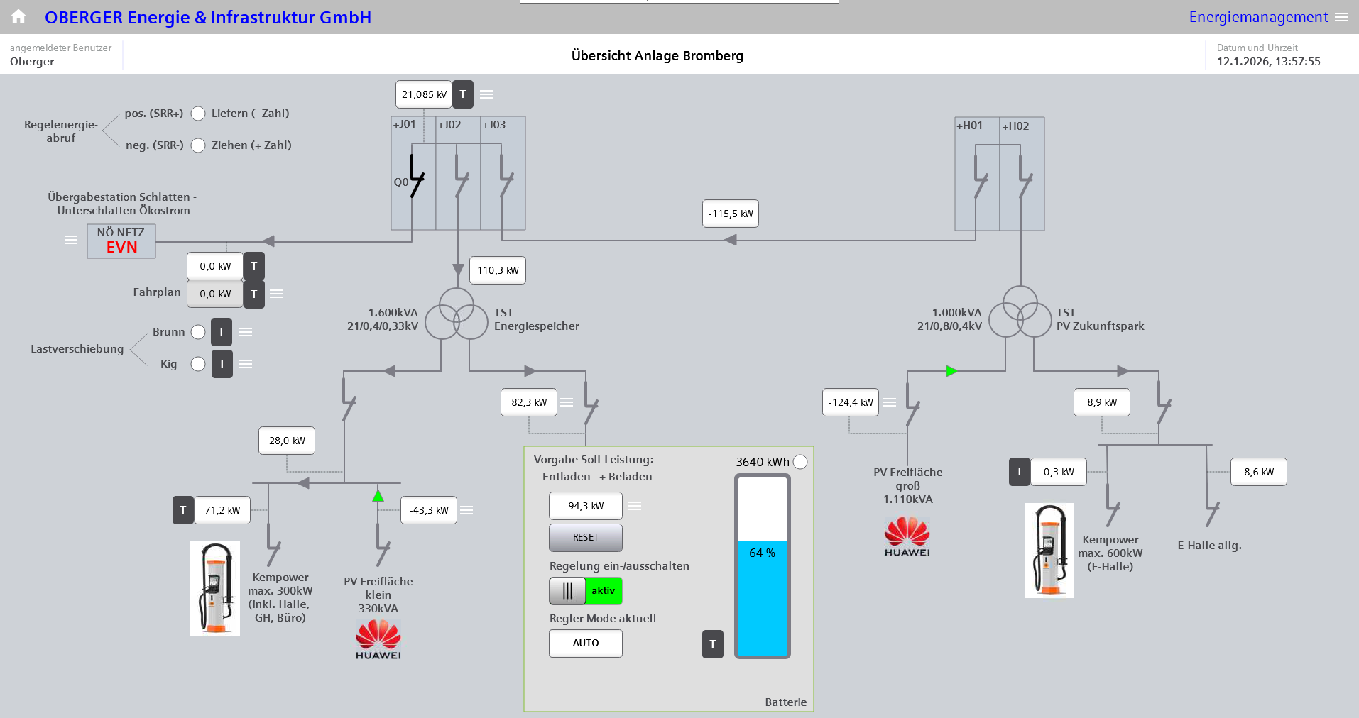 Die OBERGER Energie & Infrastruktur GmbH ist Teil der Firmengruppe Oberger und verantwortet innerhalb der Gruppe den Betrieb der Energie- und Ladeinfrastruktur. Sie betreibt zwei Freiflächen-Photovoltaikanlagen mit einer Gesamtleistung von 1.656 kWp (1.235 kWp und 421 kWp). Der daraus erzeugte Strom wird vorrangig für den Betrieb der eigenen Elektrobusflotte eingesetzt.